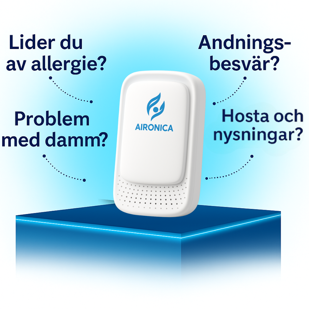 Aironica™ luftjonisator använder avancerad joniseringsteknik för att neutralisera luftburna allergener och ge renare luft i hela hemmet – bekämpar dammkvalster, instängd inomhusluft och allergisymtom på ett helt naturligt sätt, utan filter eller kemikalier.